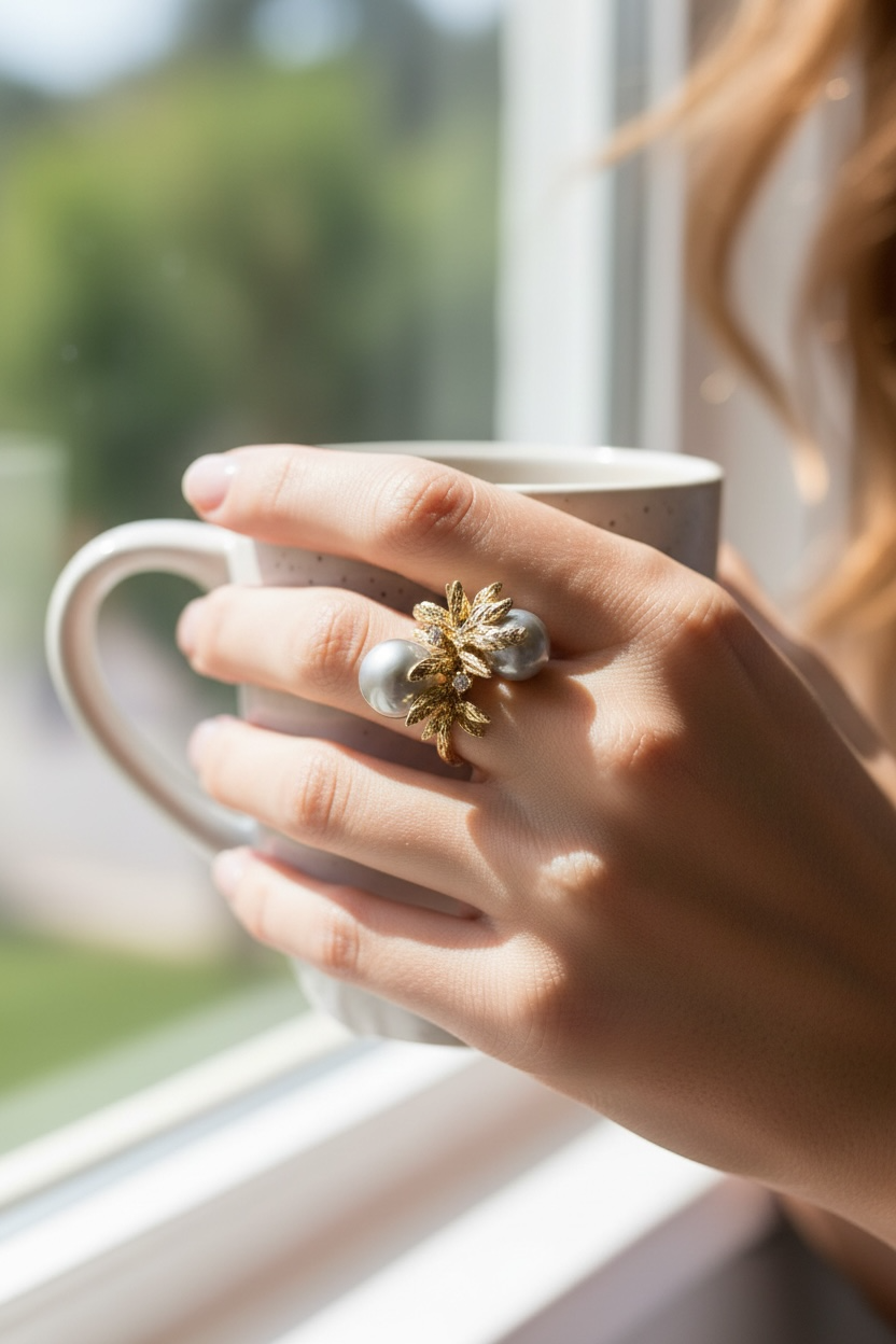 This bold and elegant Estate ring features two 8.5-9mm Baroque Tahitian pearls and two small diamonds to add to the sparkle created by the 14k yellow gold Brutalist style setting.